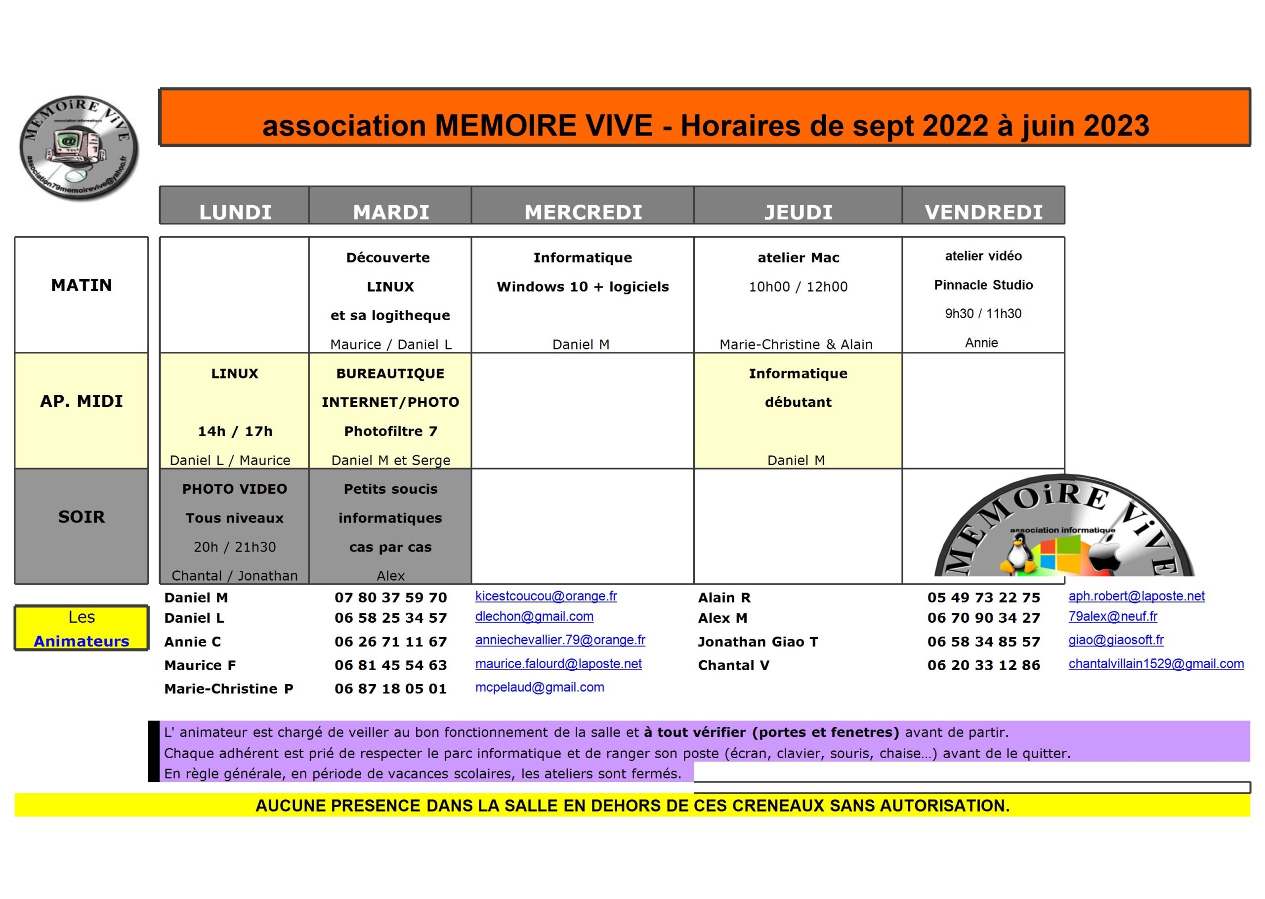 HORAIRES de nos ateliers MV