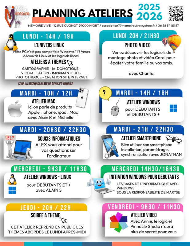 Ci-dessous, le planning des ateliers pour cette rentrée 2025/2026 : attention, l'atelier du mardi après-midi reste à confirmer (pour plus d'infos, contacter Jonathan 0658348557).